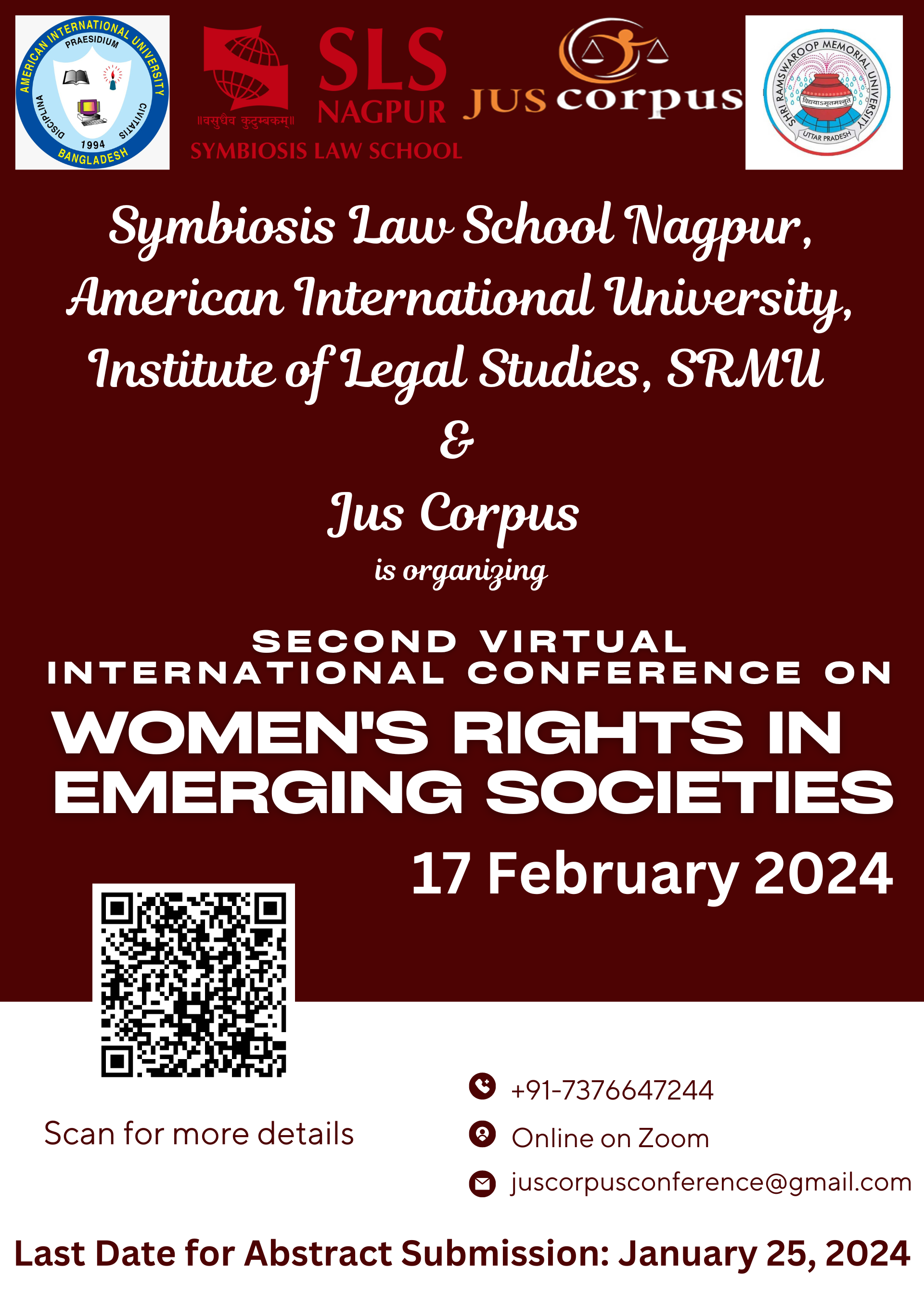 2nd International Virtual Conference On “Women Rights In Emerging Societies” By Jus Corpus, American International University Bangladesh, Symbiosis Law School Nagpur & ILS, Shri Ramswaroop Memorial University Lucknow [17th February 2024]: Submit Abstract By 25th January 2024