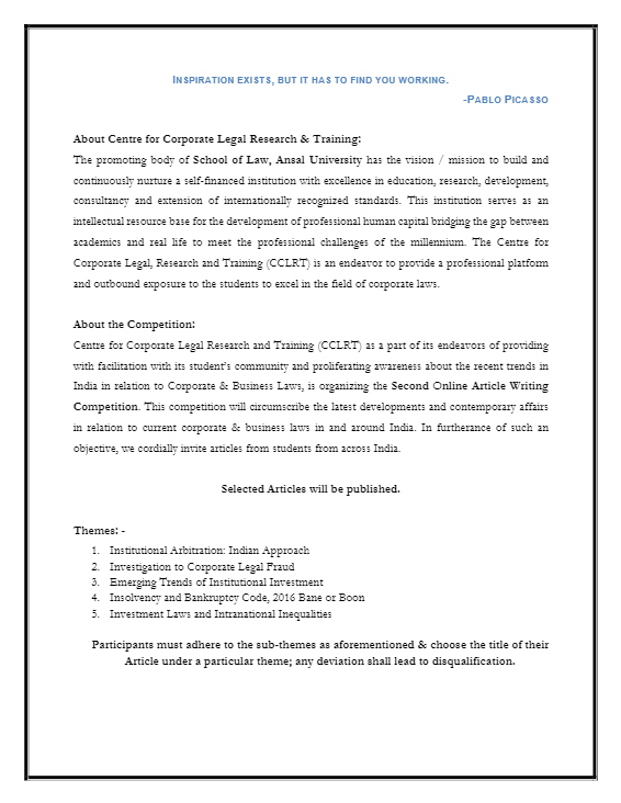 Centre for Corporate Legal Research and Training (CCLRT) as a part of its endeavours of providing with facilitation with its student’s community and proliferating awareness about the recent trends in India in relation to Corporate & Business Laws, is organizing the Second Online Article Writing Competition.