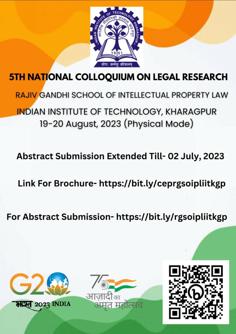 5th National Colloquium On ‘Legal Research’ By Rajiv Gandhi School Of Intellectual Property Law (RGSoIPL), Indian Institute Of Technology Kharagpur [19th-20th August 2023]: Abstract Submission Extended Till 2nd July 2023