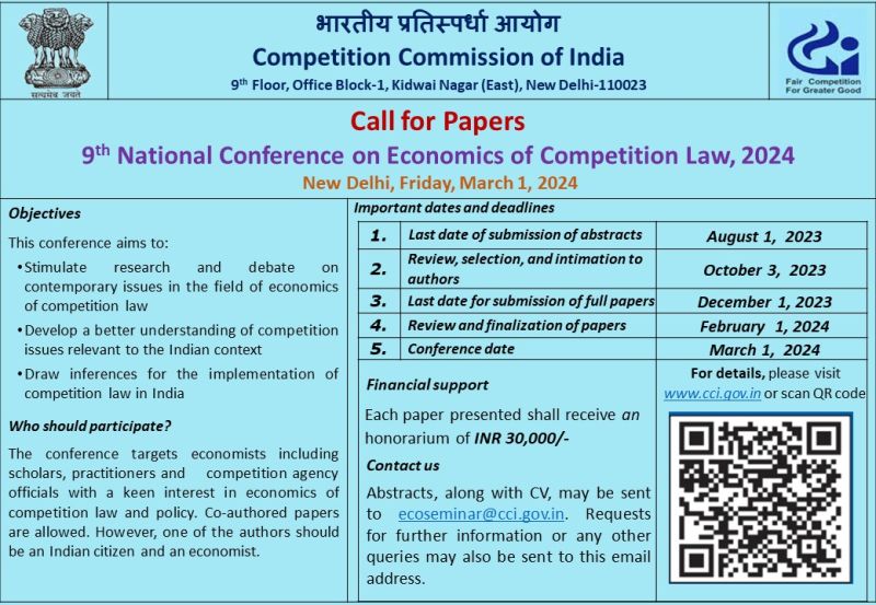The Competition Commission of India (CCI) will organize the 9th National Conference on Economics of Competition Law on Friday, March 1, 2024 in New Delhi. Each paper presented shall receive an honorarium of INR 30,000/-