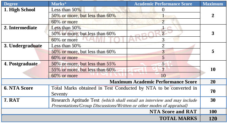 In accordance with the UGC Regulation 2022 and Ph.D. Ordinance of the University of Allahabad (vide letter no. 05/R/539/2019 dated 20th June 2019), 70% of weightage will be given to the examination conducted by NTA and 30% to the Test, (which shall entail an interview and may include Presentations/Group Discussions/Written or other modes of appraisal). The shortlisting criteria for the admission shall be, Marks Obtained by the applicant in the examination conducted by NTA only. When the CSIR/UGC publish normalised score for any subject then for shortlisting of these applicants normalised score obtained by them shall be considered.