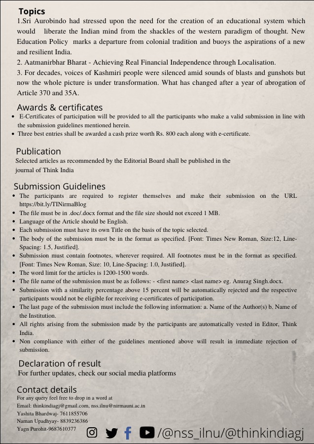 “स्वतंत्र लेख” is a blog writing competition organised by Think India, Gujarat and NSS unit of Institute of Law, Nirma University. This competition is organised on the occasion of independence day in order to give opportunities to the  authors to express their thoughts and give their views on 74 year old independent India