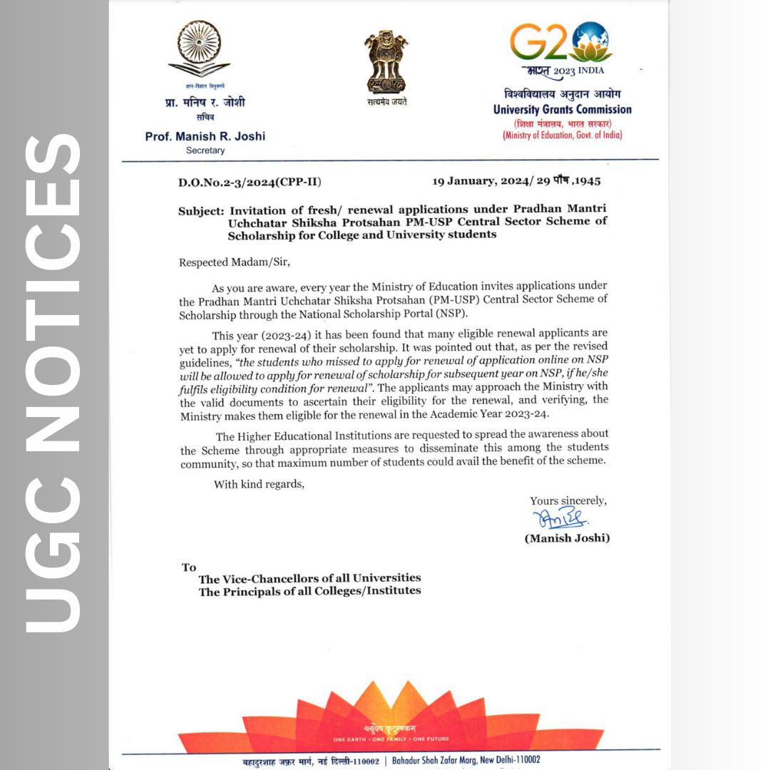 University Grants Commission (UGC) has issued invitation of fresh/ renewal applications under Pradhan Mantri Uchchatar Shiksha Protsahan PM-USP Central Sector Scheme of Scholarship for College and University students. Every year the Ministry of Education invites applications under the Pradhan Mantri Uchchatar shiksha Protsahan (PM-usP) central sector scheme of Scholarship through the National Scholarship Portal (NSP). This year it has been found that many eligible renewal applicants are yet to apply for renewal of their scholarship. The students who missed to apply for renewal of application online on NSP will be allowed to apply for renewal of scholarship for subsequent year on NSP, if he/ she fulfils eligibility condition for renewal.