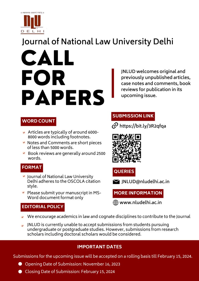 Call For Papers For Journal Of National Law University Delhi (JNLUD) (Vol. 10, 2023-24), National Law University, Delhi [ISSN No: 2277-4017]: Submit By 15th February 2024