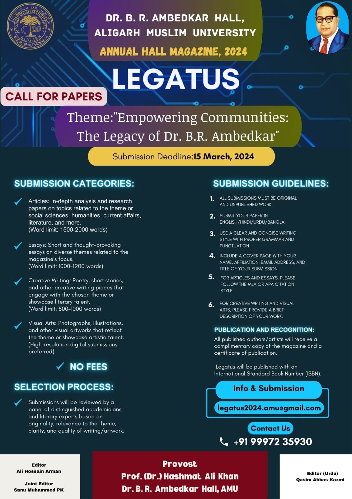 Call For Papers For LEGATUS-Dr. B.R. Ambedkar Hall, Aligarh Muslim University Annual Hall Magazine, 2024: Submit By 15th March 2024