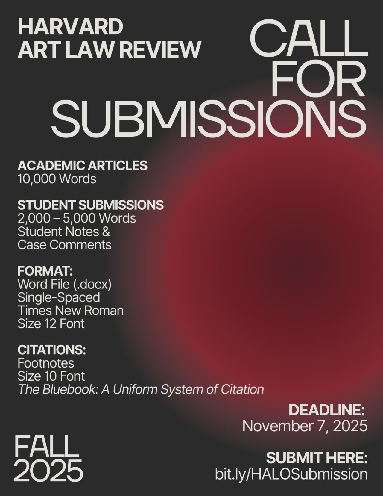The Harvard Art Law Review is now open to submissions for our Fall 2025 Issue.