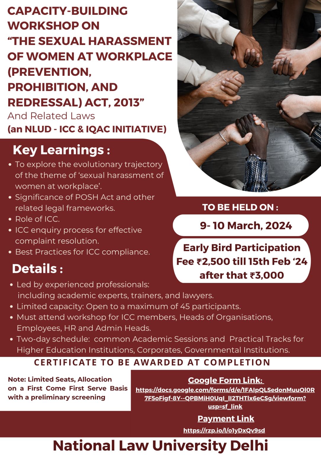 The National Law University, Delhi (NLU Delhi) has been established with a mandate to transform and redefine the process of legal education. Dynamic in vision and robust in commitment, the University in a very short span of time has shown terrific promise to become a world class institution. Capacity Building POSH Workshop is being organised by National Law University, Delhi under the aegis of ICC & IQAC.
