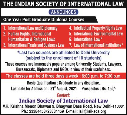 The Indian Society of International Law- POST GRADUATE DIPLOMA COURSES ON INTERNATIONAL LAW- Apply by 31st August 2021(EXTENDED)
