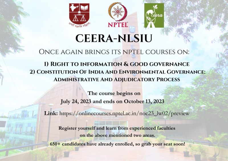 Centre For Environmental Law Education Research & Advocacy (CEERA), National Law School Of India University (NLSIU), Bengaluru Invites Application For Its NPTEL MOOC Courses On ‘Right To Information And Good Governance’ And ‘Constitution Of India And Environmental Governance: Administrative And Adjudicatory Process’: Apply By 31st July ππππ