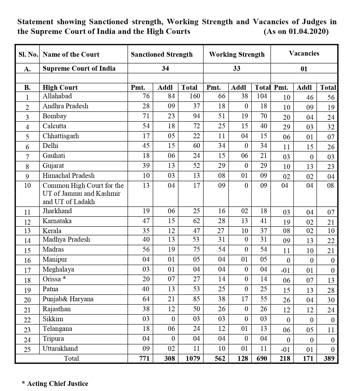 Over 389 Vacancies of Judges in 25 High Courts in the country as on April 01, 2020.
