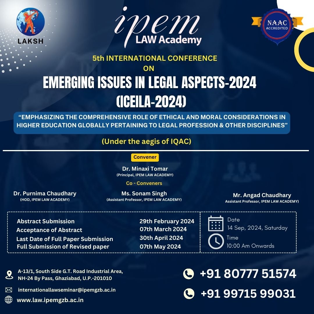 5TH International Conference On Emerging Issues In Legal Aspects-2024 (ICEILA-2024) By IPEM Law Academy Ghaziabad, Under The Aegis Of IQAC Cell Of IPEM Law Academy [14th September 2024, In Hybrid Mode]: Submit Abstract By 29th February 2024