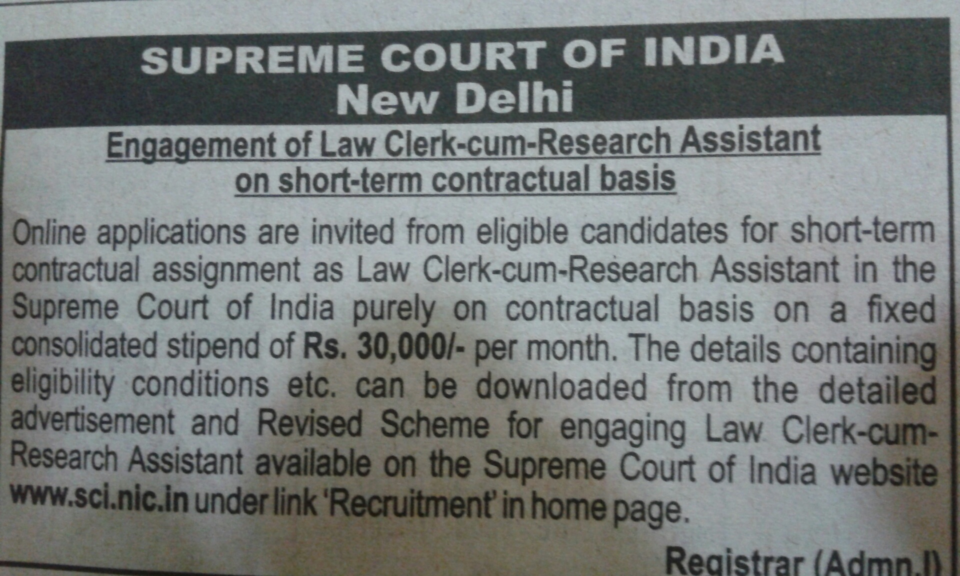 LAW CLERK-CUM- RESEARCH ASSISTANT: Engagement of Law Clerk-cum- Research Assistant on short-term purely contractual basis in the Supreme Court of India. Consolidated Stipend of Rs. 30000/- per month.
