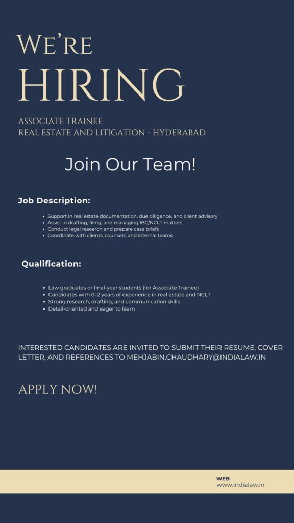 Apply Now: Send your CV to mehjabin.chaudhary@indialaw.in with subject line Application – Associate Trainee (Hyderabad).
