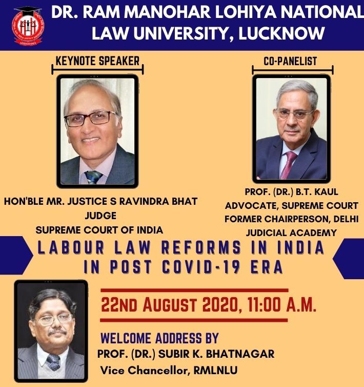 RMLNLU’s Webinar on Labour Law Reforms in India Post COVID-19 Era [Aug 22, 11 AM-12:30 PM]: Register Now