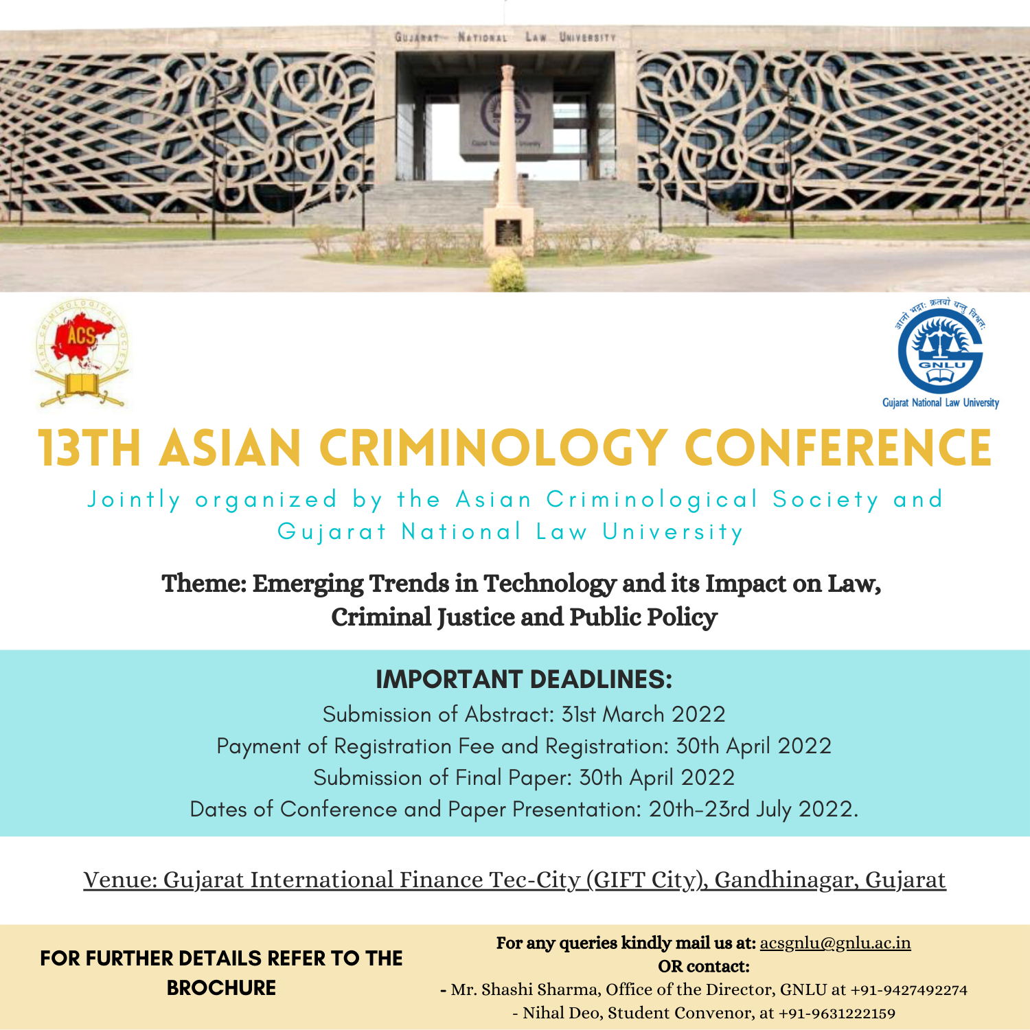 13th ASIAN Criminology Conference on the theme “Emerging Trends in Technology and its Impact on Law, Criminal Justice and Public Policy”-Asian Criminological Society and Gujarat National Law University- Submit by 30th April 2022.