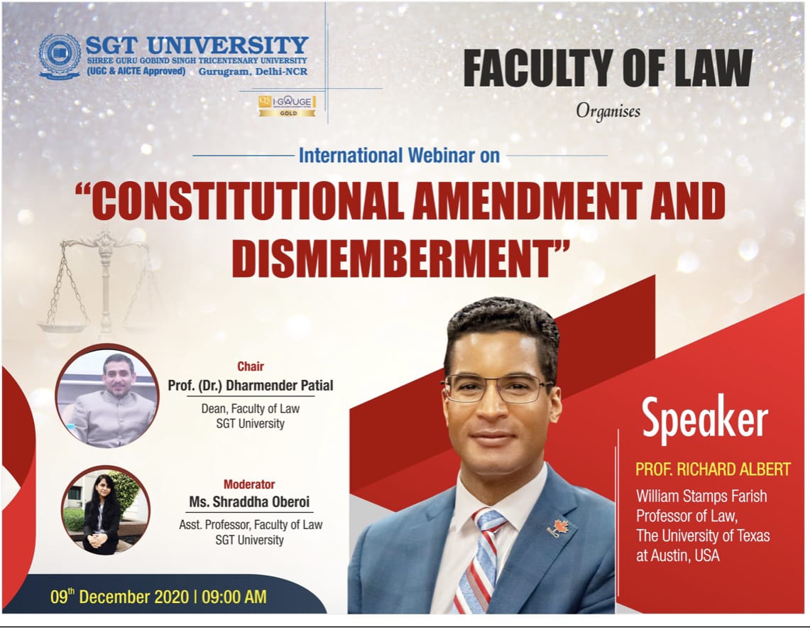 Faculty of Law, SGT University organizing International Webinar on Constitutional Amendment & Dismemberment by By Prof Richard Albert, William Stamps Farish Professor of Law, The University of Texas, Austin, USA (9th Dec 2020, 9:00)