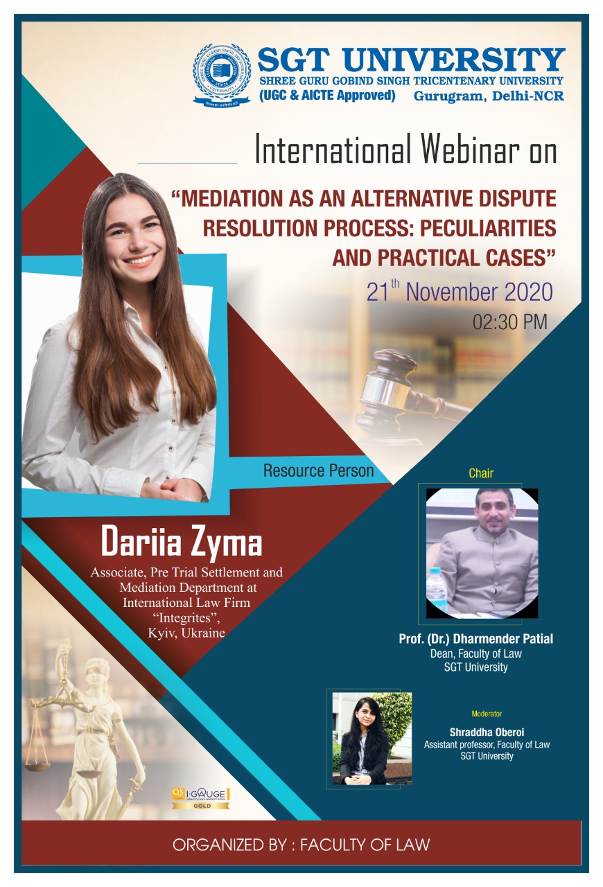 Faculty of Law, SGT University organizing International Webinar on “Mediation as an Alternative Dispute Resolution Process: Peculiarities and Practical Cases” on 21st Nov., 2020 at 2:30pm By Dariia Zyma, Associate, Pre-trial Settlement and Mediation Department at International Law Firm, INTEGRITES, Kyiv, Ukraine.