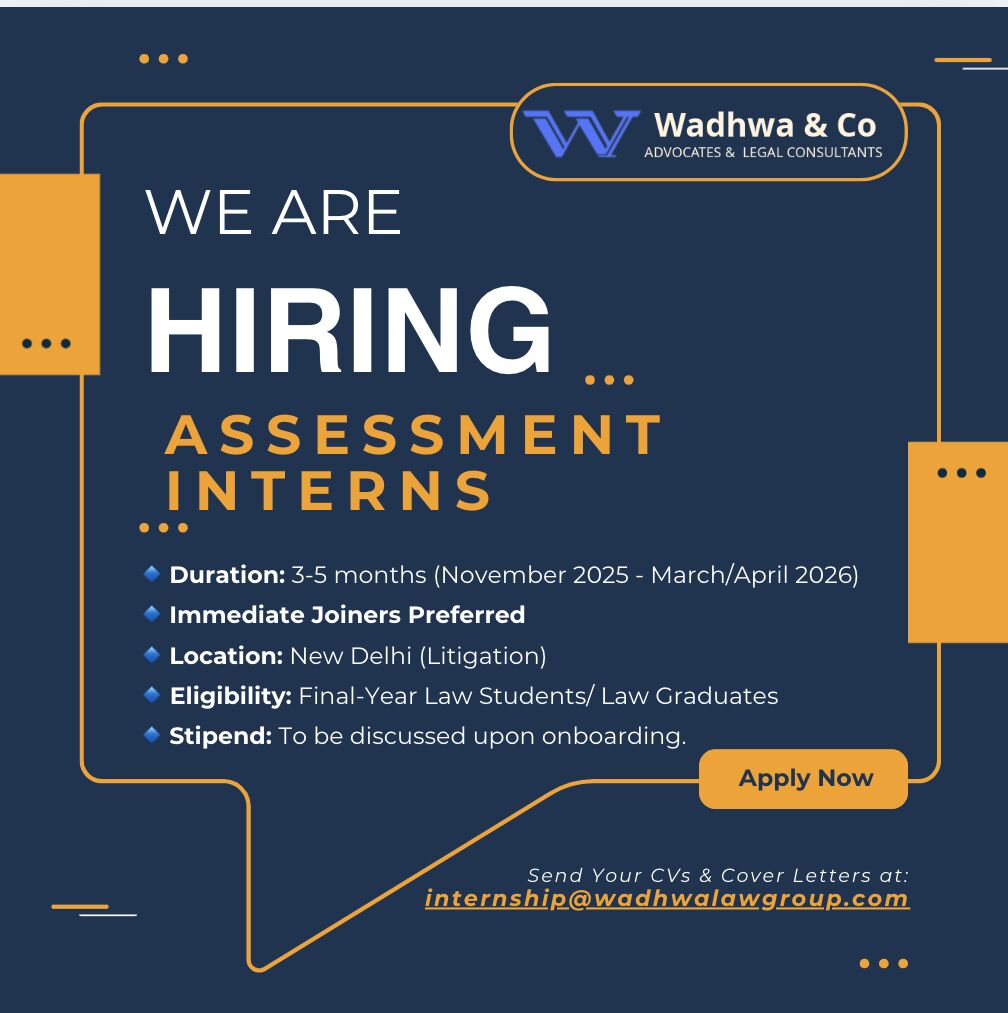 Wadhwa & Co., a New Delhi-based litigation firm, is inviting applications for its Assessment Internship Program scheduled upto December 2025. This opportunity is ideal for law students eager to gain practical exposure to courtroom procedures, legal drafting, and case strategy.