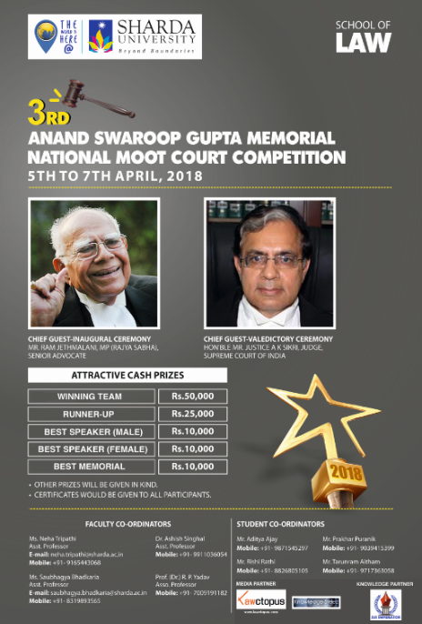 3rd Anand Swaroop Gupta Memorial National Moot @ Sharda University, Noida [April 5-7]: Free Agra Trip; Register by March 25