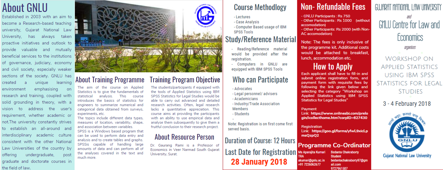 ‘Workshop on Applied Statistics using IBM SPSS Statistics for Legal Studies’ on 3-4 February, 2018 under the Center for Law and Economics.