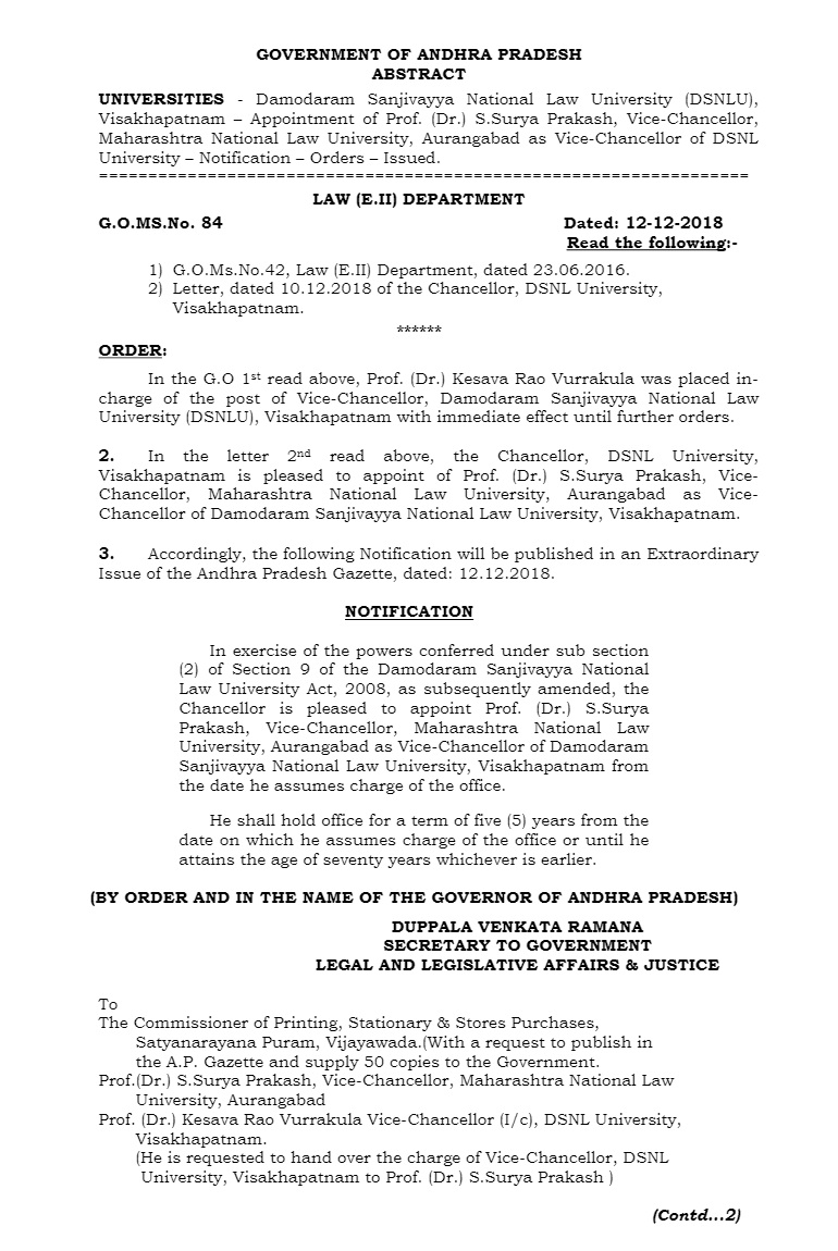 Prof. (Dr) S. Surya Prakash appointed as Vice Chancellor of Damodaram Sanjivayya “National Law University” (DSNLU), Visakhapatnam