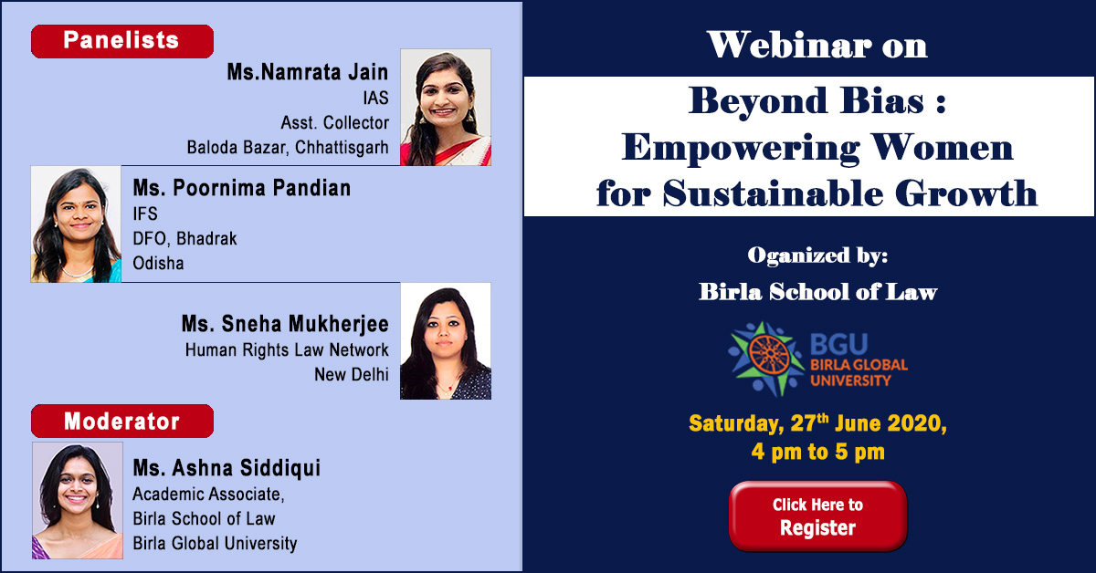 Birla School of Law, Birla Global University Bhubaneswar is conducting a webinar on “Beyond Bias: Empowering Women for Sustainable Growth” on 27th June 2020 at 4:00 PM IST.