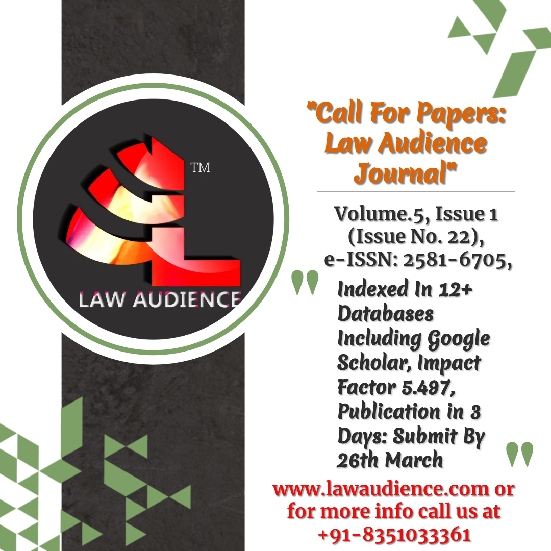 Law Audience Journal (e-ISSN: 2581-6705), [Volume.5, Issue 1 (Issue No. 22): Submit Research Paper By 26th March 2023