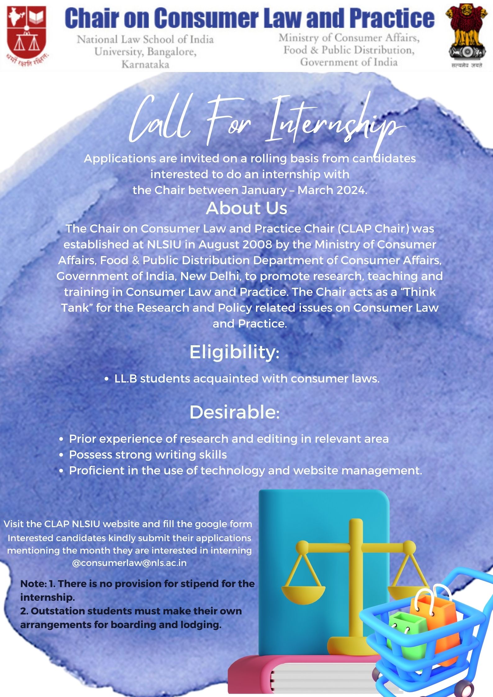 The Chair on Consumer Law and Practice Chair (CLAP Chair) was established at NLSIU in August 2008 by the Ministry of Consumer Affairs, Food & Public Distribution Department of Consumer Affairs, Government of India, New Delhi, to promote research, teaching and training in Consumer Law and Practice. The Chair acts as a “Think Tank” for the Research and Policy related issues on Consumer Law and Practice.