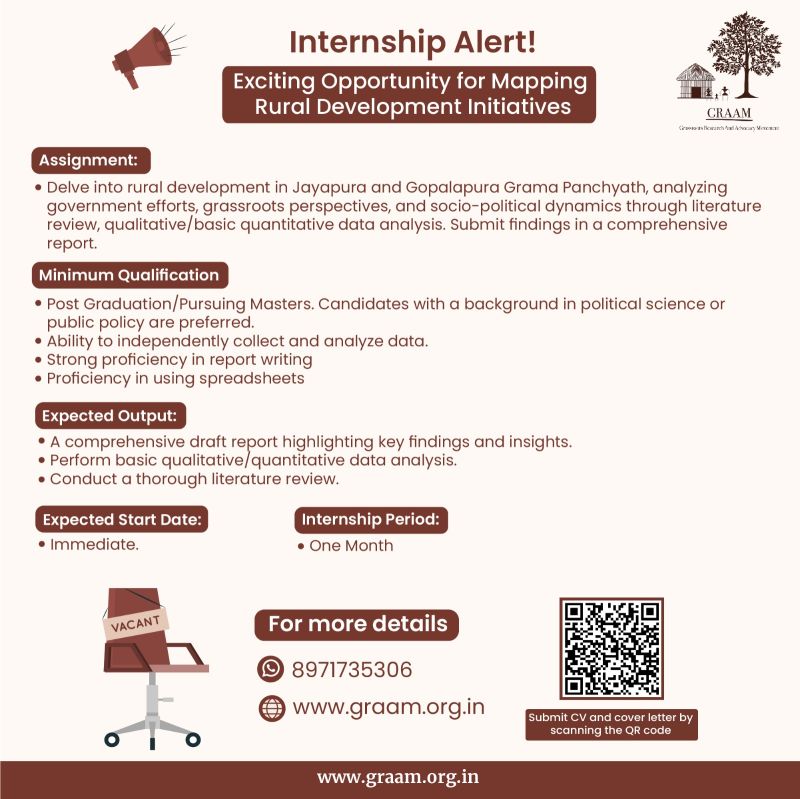 • This internship offers a unique chance to analyze government and institutional efforts in Jayapura and Gopala pura Gramapanchyath. Beyond textbooks, explore grassroots perspectives, unravel socio-political dynamics, and witness the impact of decentralization on rural governance.
