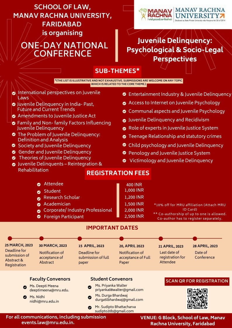 National Conference On ‘Juvenile Delinquency: Psychological & Socio-Legal Perspectives’ By Manav Rachna University (MRU), Faridabad [28th April 2023]: Submit Abstract By 25th March 2023