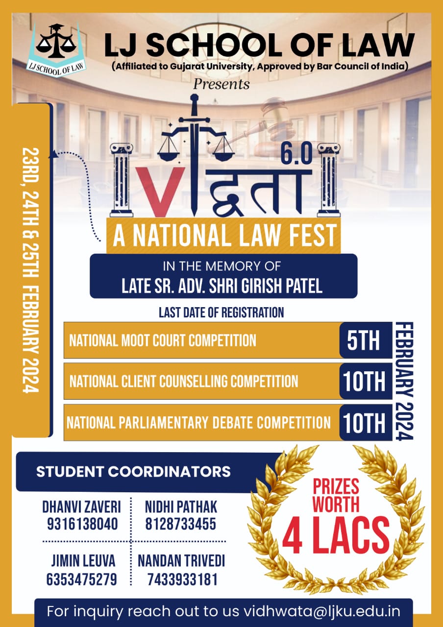National Law Fest – ‘Vidhwata’ By LJ School Of Law, Ahmedabad (Affiliated To Gujarat University) [23rd-25th February 2024]: Register Now!