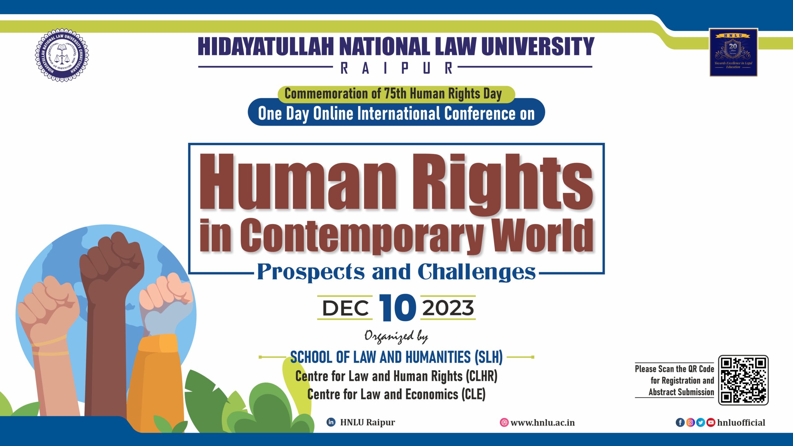 To commemorate the 75th Human Rights Day On 10th December, 2023, HNLU is organizing a One Day Online International Conference On ‘Human Rights In Contemporary World: Prospects And Challenges’ which is being organized by the SCHOOL OF LAW AND HUMANITIES (SLH), Centre for Law and Human Rights (CLHR) & Centre for Law and Economics (CLE) Hidayatullah National Law University, Chhattisgarh