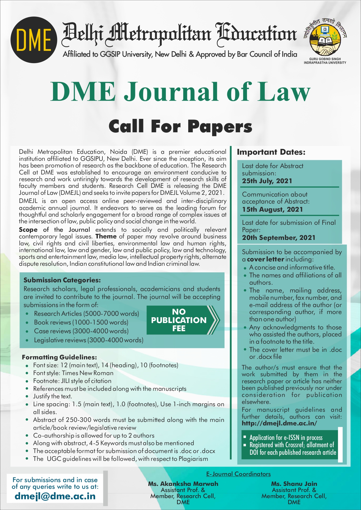 Cfp for law Students:- DME’s e-journal, DME Journal of Law (DMEJL) Volume 2, 2021.