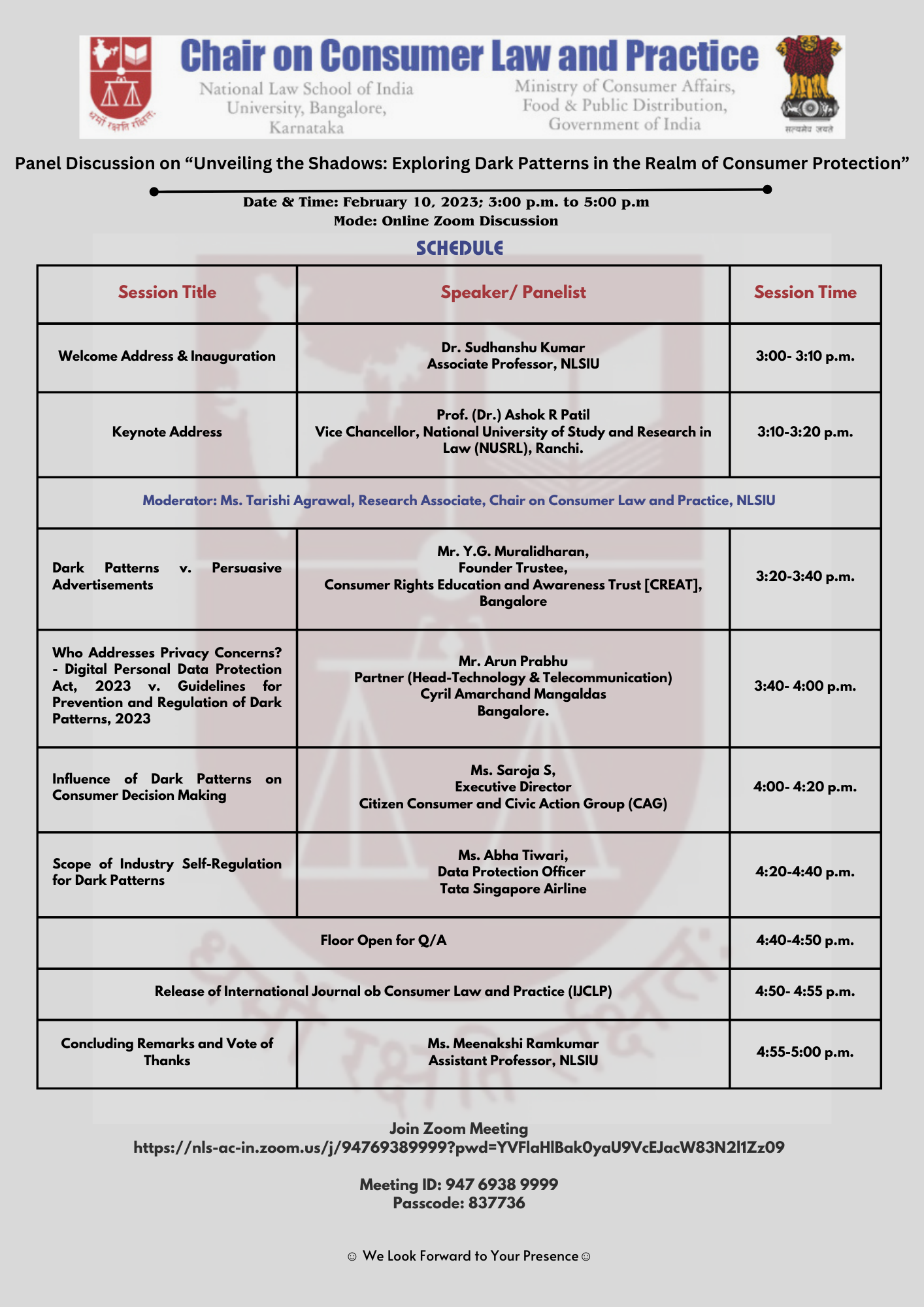 Virtual Panel Discussion On “Unveiling The Shadows: Exploring Dark Patterns In The Realm Of Consumer Protection Law” By The Chair On Consumer Law And Practice (CLAP/ Chair), National Law School Of India University, Bengaluru [10th February 2024]
